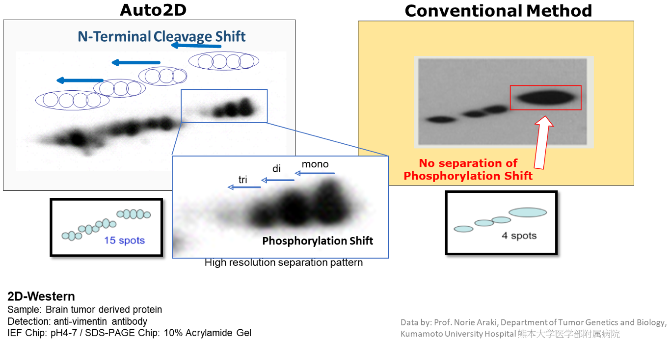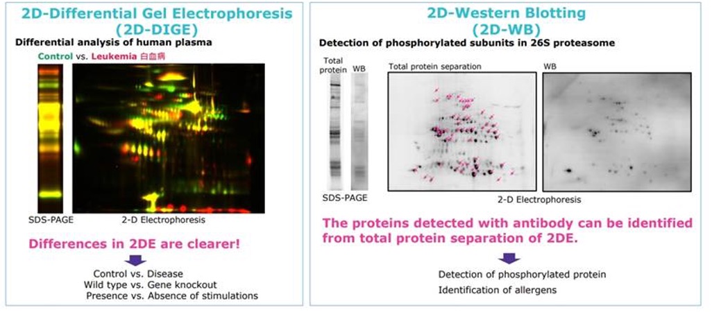 此外,~ 20 μg 的微量樣本分離(可視化點數約為 700 個),可檢測包括轉譯後修飾在內的約5,000種蛋白質(根據免疫印跡的反應性推測)。實現了分離的高分辨率(pH 0.05差異)甚至用於蛋白質磷酸化,這是與細胞調節相關的重要化學變化。