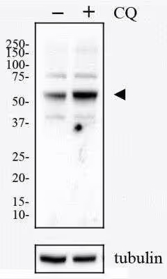 Western Blot: HeLa Chloroquine Treated / Untreated Cell Lysate [NBP2-49689] Western Blot: HeLa Chloroquine Treated / Untreated Cell Lysate [NBP2-49689] - HeLa cells were treated with (+) or without 50 uM (-) of Chloriquine (CQ) for 24 hours. Total cell lysates were prepared and separated on a 12% gel by SDS-PAGE. Protein was transferred to PVDF membrane and blocked in 5% non-fat milk. The membrane was then probed with 2 ug/ml of p62/SQSTM1 antibody (NBP1-42821) in 1% milk and detected with an anti-rabbit HRP secondary antibody using chemiluminescence. Note the upregulation of p62 (arrowhead) in response to chloroquine treatment and the blockage of autophagy. |