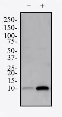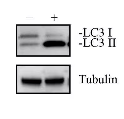 Western Blot: HeLa Chloroquine Treated / Untreated Cell Lysate [NBP2-49689] Western Blot: HeLa Chloroquine Treated / Untreated Cell Lysate [NBP2-49689] - Human Cervical carcinoma cells (HeLa) were treated with (+) and without (-) 50 uM Chloroquine overnight. Whole cell protein lysates were prepared in 1x Laemmli sample buffer and approximately 10 ug of each lysate (NBP2-49689) was separated on a 4-15% gel by SDS-PAGE, transferred to 0.2 um PVDF membrane and blocked in 5% non-fat milk in TBST. The membrane was probed with 1 ug/ml anti-LC3 (NB100-2220) and 1 ug/ml anti-alpha tubulin (NB100-690) as a loading control, and detected with the appropriate secondary antibodies using chemiluminescence. |