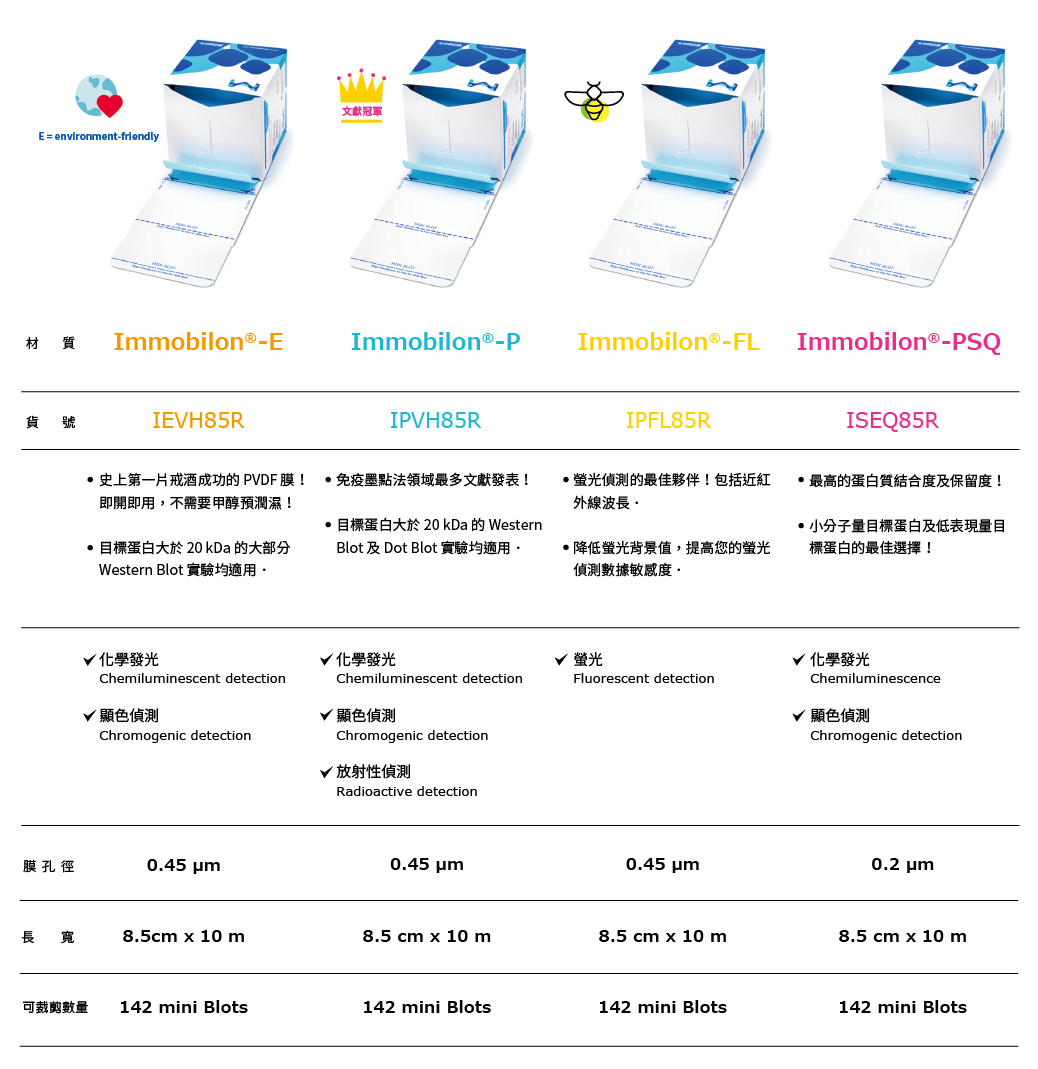 | Immobilon®-P(0.45 µm) ★ 可結合廣泛分子量蛋白 ★ 具高蛋白保留性、物理強度與化學相容性 ★ 適合多次染色與免疫偵測再探測(reprobing) |