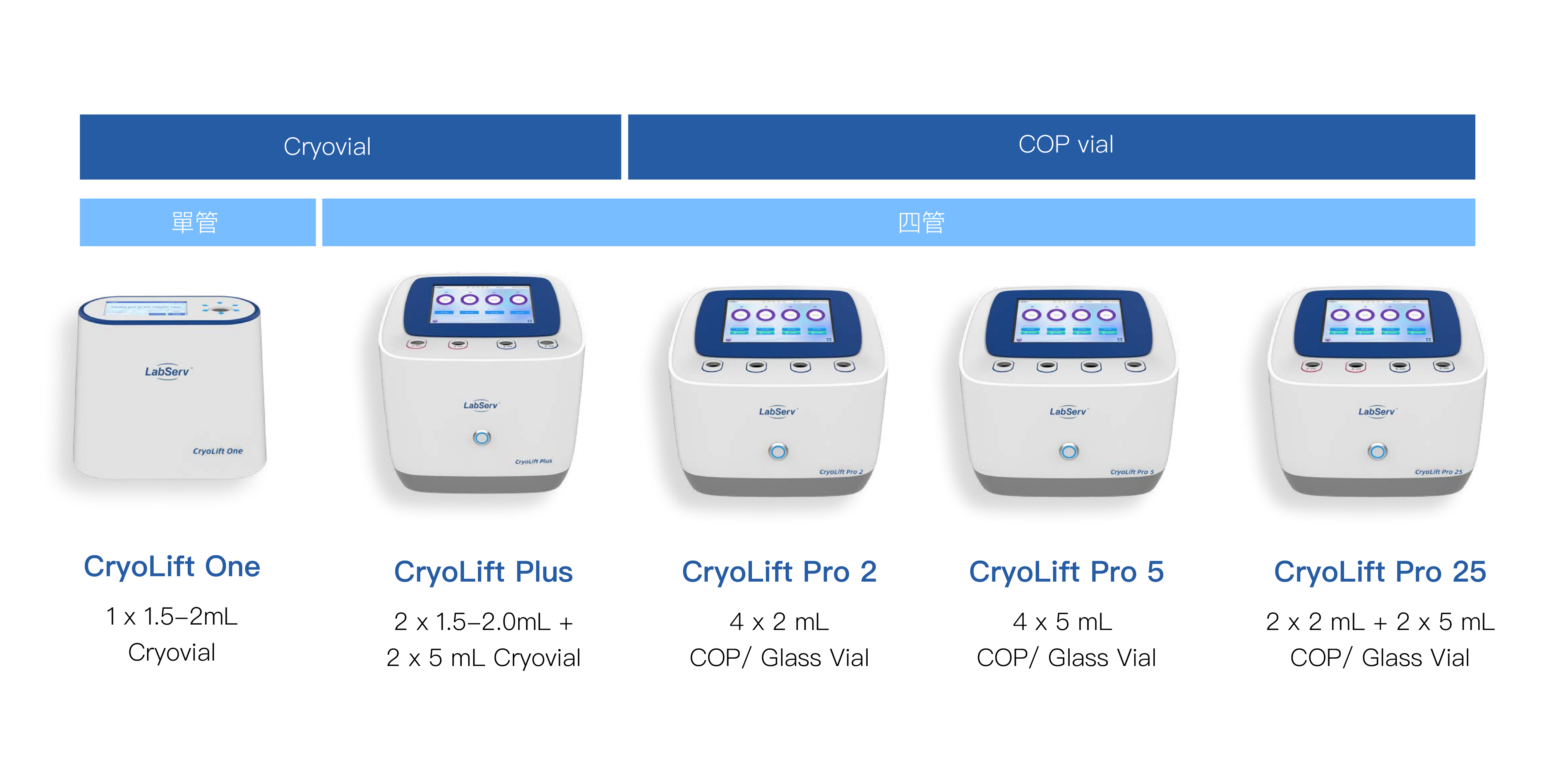 依照細胞凍存形式,可分成細胞凍存管或是細胞凍袋適用機型