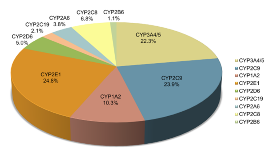 在肝臟細胞中,CYP酵素的Isoform占比百分比