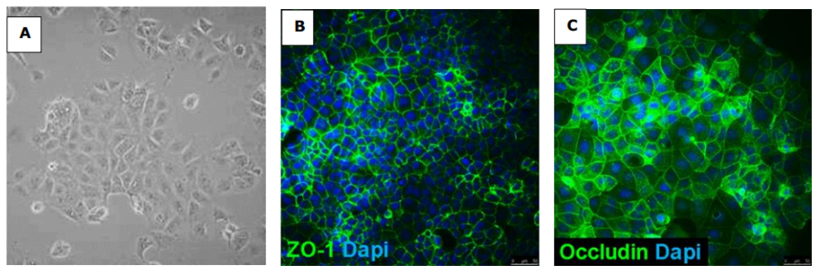 Caco-2/TC-7 培養一天後,表現tight junction protein ZO-1和Occludin.