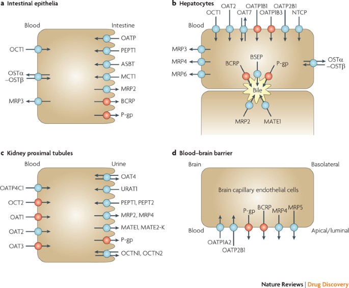 轉運蛋白分布在身體各處,主動運輸會經由轉運蛋白(transporter) 的協助來轉運,其中腸上皮細胞、肝臟、腎臟、皮膚和腦部微血管的內皮細胞都有跟藥物相關的轉運蛋白可以協助藥物送往其他區域。
