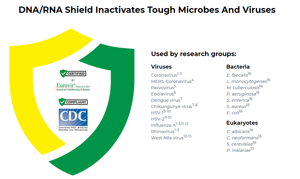 DNA/RNA Shield 能在室溫下保存 DNA & RNA > 30天,其抑制病毒活性的能力獲得德國 EUROVIR® Hygiene-Labor GmbH 第三方實驗室證實、符合歐洲 EN 14476:2017 規定且遵守美國 CDC 規範,採檢及運輸過程都安心不用怕!