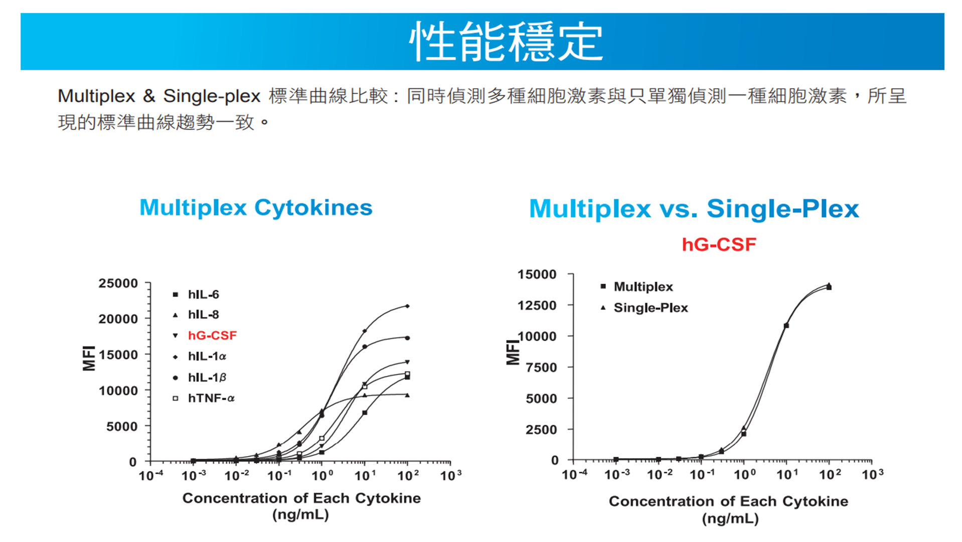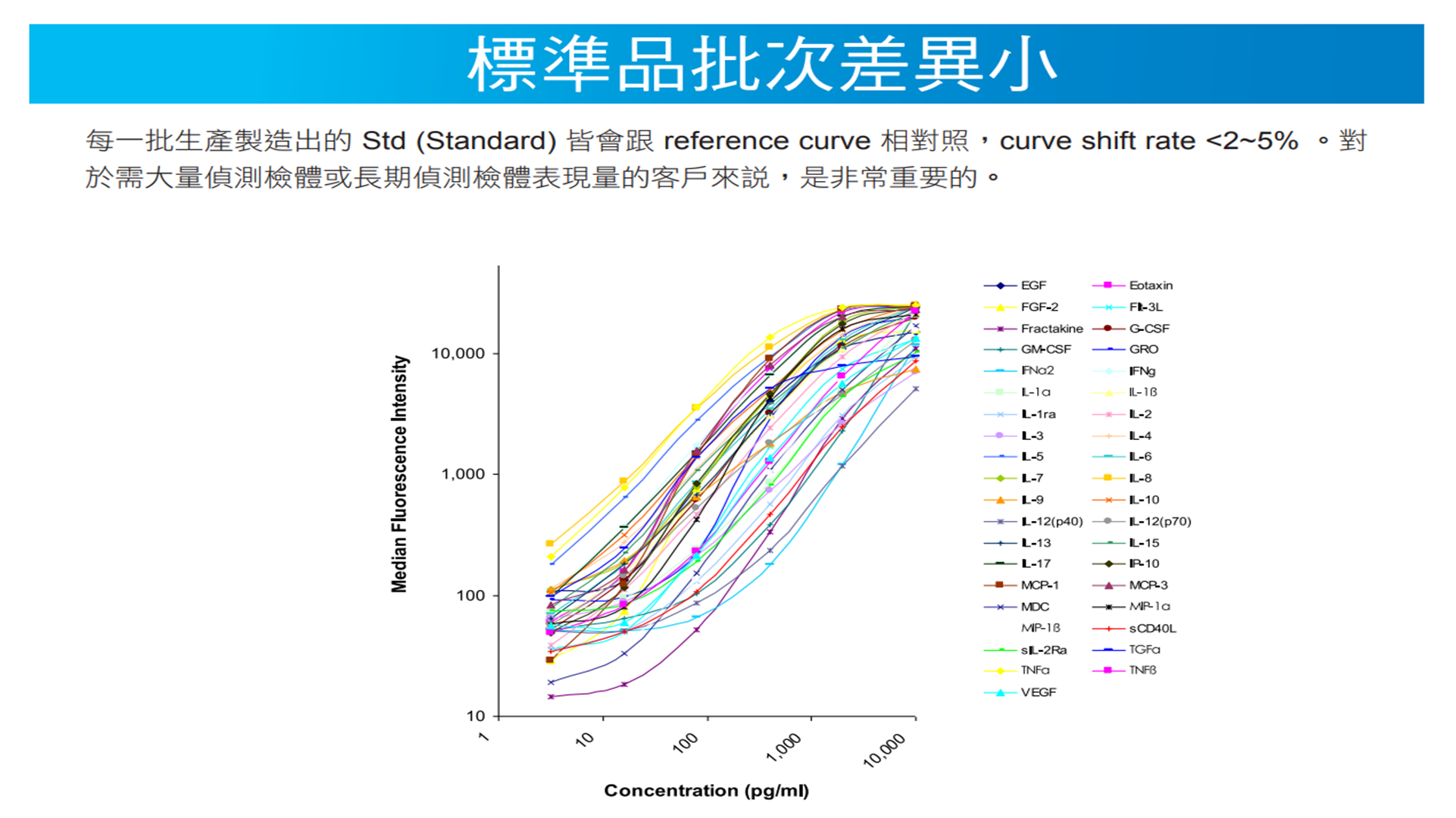 每組產品皆提供 Intra-assay CV% 及 Inter-assay CV% 的數值,且每批標準品皆經過嚴謹的測試,性能穩定且差異性小。