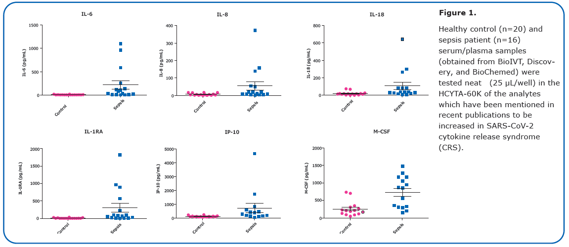 一些有關 COVID-19 細胞因子圖譜的早期研究發現,IL-2、IL-7、G-CSF、IP-10、MCP-1、MIP-1α、TNFα 和 Ferritin 的水平升高,同時也發現 IL-6 隨著 SARS-CoV-2 感染而增加。Tocilizumab 是一種針對 IL-6 受體(IL-6R)的免疫抑制性單株抗體療法,已於 2020 年 3 月 26 日被 FDA 批准用於 III 期臨床試驗治療 COVID-19 肺炎。另外,COVID-19 患者的 IL-1β、IL-1RA、IL-8、IL-9、IL-10、FGF-basic、GM-CSF、IFNγ、MIP-1β、PDGF 和 VEGF 與健康受試者相比皆有所增加。SARS-CoV-2 的研究也在其他動物模型,例如獼猴中進行,這將使研究人員能夠在動物模型中測試可能的疫苗和抗病毒藥物/治療。一篇尚未發表的研究使用 MILLIPLEX® 於非人類靈長類動物,測定在多個時間點血清中 Cytokine 及 Chemokine 水平變化,顯示伴隨 TGFα 有所降低,IL-1RA、IL-6、IL-10、IL-15、MCP-1、MIP-1β 則有所增加。