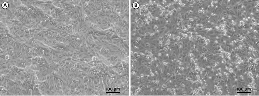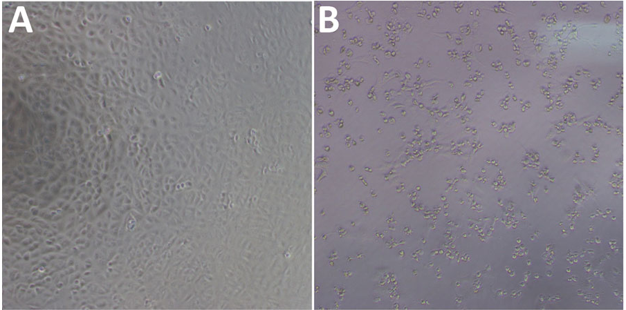 目前用於分離 SARS CoV-2 病毒的細胞有 Vero E6、Vero-CCL81 及 Human Lung Cell Huh-7 等細胞株。可將帶有病毒之檢體接種於上述的細胞,於 37°C, 5% CO2 培養箱進行培養,進行細胞病變 (Cytopathic Effect) 的每日觀察,於 3 天後可明顯觀察到細胞變圓及聚集的細胞病變 (下圖中的 b, B),培養的上清液與細胞分別以 RT-PCR 及使用 SARSr-CoV Rp3 NP antibody 進行免疫螢光染色確認病毒。