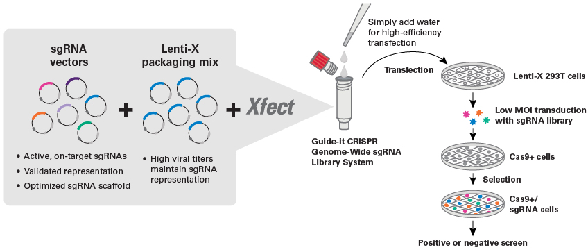 Takara Bio 提供混合的慢病毒 sgRNA 基因庫系統 Guide-it CRISPR Genome-Wide sgRNA Library System,可用於在人類細胞中進行表型剔除 (phenotypic knockout) 篩選。該基因庫系統是基於 Brunello 基因庫 (Doench et al. 2016; Doench et al. 2018) 設計,包含超過 76,000 條 sgRNA,針對約 19,000 個基因,每個基因有四條高效的 sgRNA 以及 nontargeting sgRNA control。此擴增的基因庫經過了充分驗證,以可即時轉染 (transfect) 的凍乾形式提供,可以讓研究學者輕鬆製備出高效價的慢病毒並進行全基因組 CRISPR 篩選。