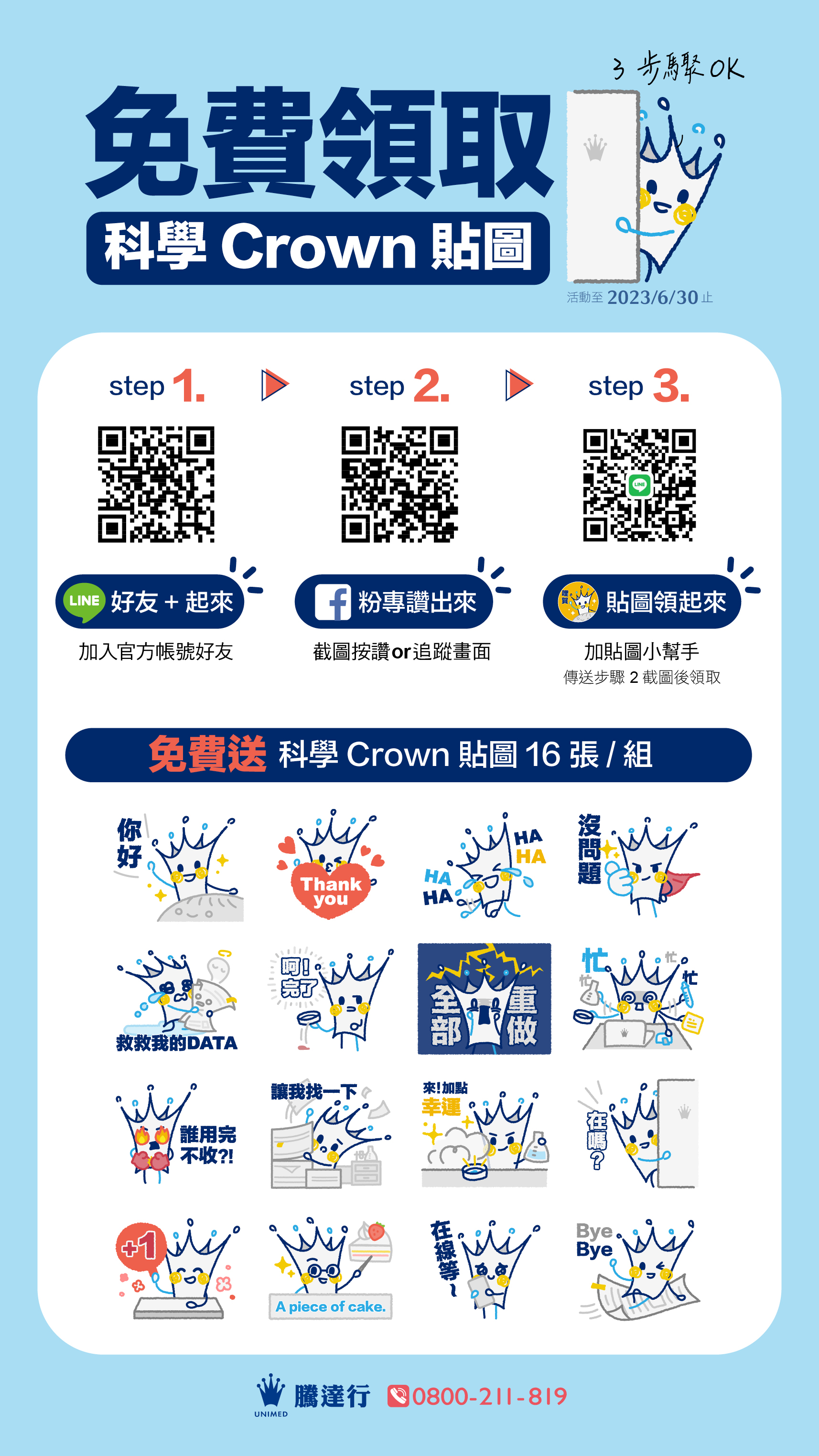 2.遠端領取:加入騰達行貼圖小幫手帳號(LINE ID:0919808536/qrcode),並傳送FB按讚or追 蹤畫面,貼圖小幫手會在工作日(約1-2天),將科學Crown永久貼圖送給你喔!