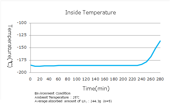 將液態氮倒入 CryoHandy 中,在吸附量為 244.3 g(平均值,n = 5)和環境溫度為 25°C 的條件下測量容器內的溫度。