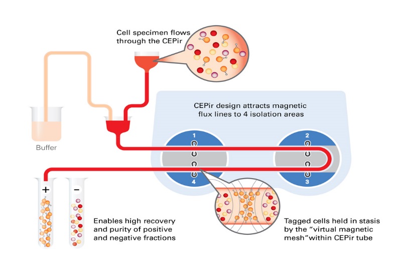 CEPir 細胞磁珠分選系統,利用可調節之磁場及液流系統,從混合之細胞溶液中,分離出標的細胞。在細胞分離實驗中,CEPir 將開啟四個磁場區域,細胞樣品懸浮液流經 CEPir 分離管時,被磁珠標記的標的細胞,受磁力吸附在 CEPir 管道中,而未被標記的細胞則可通過系統流出。磁場關閉時,標的細胞即會被釋放並流入收集管中。