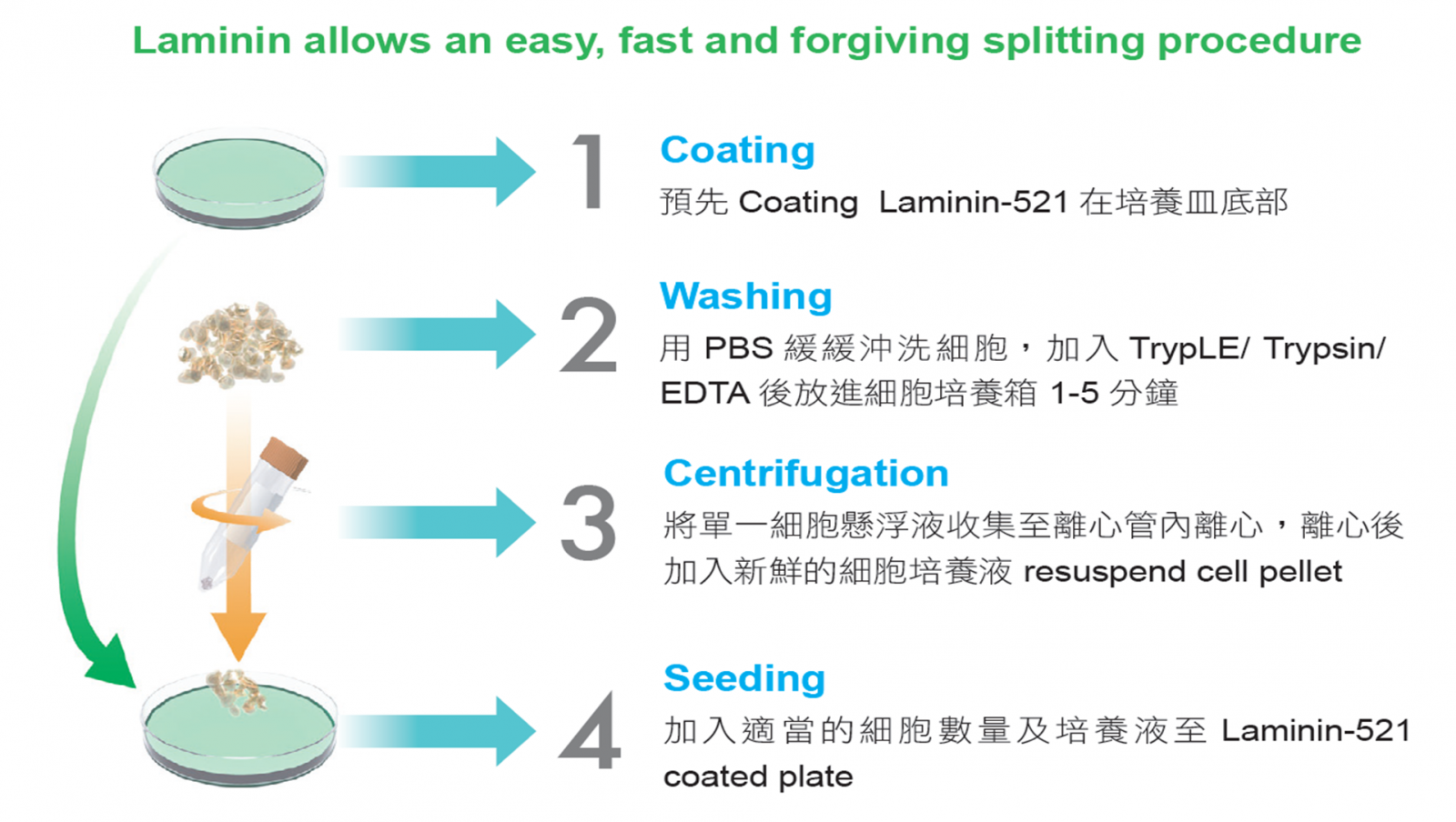 LN-521 為幹細胞生長時周遭環境的關鍵成員,於胚胎早期已開始表現,即提供接近天然環境中維持幹性 (Stemness),即自我更新和高度分化能力
