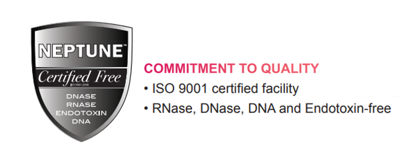 Neptune 是具有超過 22 年製造實驗室相關耗材的公司,生產各式 Tips、Tubes 及 PCR plates。所有產品皆在 Neptune 具有 ISO9001:2008 認證的工廠製造,並經過嚴格且先進的品質監控和獨立的批號測試,產品皆為 DNase,RNase,DNA 和 Endotoxin-free。
