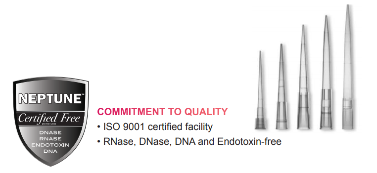 Neptune 是具有超過 22 年製造實驗室相關耗材的公司,生產各式 Tips、Tubes 及 PCR plates。所有產品皆在 Neptune 具有 ISO9001:2008 認證的工廠製造,並經過嚴格且先進的品質監控和獨立的批號測試,產品皆為 DNase、RNase、DNA 和 Endotoxin-free。