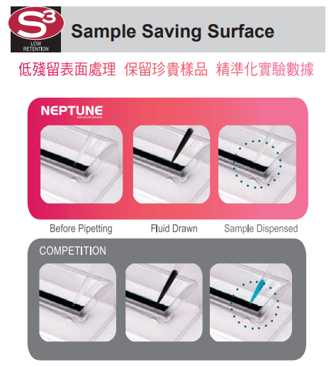 Neptune 是最早設計出以氣溶膠 (Aerosol) 阻隔水氣的 Tip,減少交叉污染的機率;同時 Neptune 也是最早開發以低殘留聚合物 S3 (Sample Saving Surface) 解決樣品殘留的問題;及率先發展出環保型產品 ESP (Environmentally SustainablePack) 專利的快速填充系統 (Reload System),大幅減少近 90% 的塑料廢棄物。