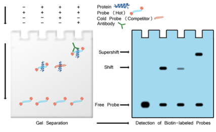 將 Biotin 標定一段含有欲探測序列的 probe,和含有欲測細胞核蛋白質萃取液反應後,反應物進行電泳,未形成 TFs-probe 複合體在膠體中移動得較快;反之,形成 TFs-probe 複合體移動得較慢,由膠體上可以看出兩者的差異,圖中標示的「shift」。如果想要了解與 probe 結合的是哪些蛋白質,可以在電泳之前,先以抗體加入反應,如果此抗體與 TFs-probe 結合, Ab-TFs-probe 複合體在膠體中的移動速度,移動速度會更慢於 TFs-probe 複合體,如圖中標示的「supershift」,以此確定 TFs-probe 複合體其中一種蛋白質成份。