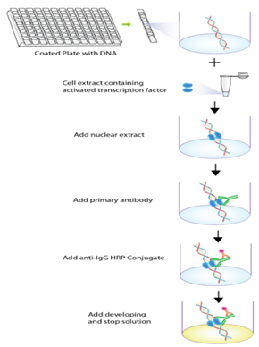 多種樣本之細胞核蛋白質萃取液與欲探測序列的 probe 反應,經 wash 步驟將未形成 TFs-probe 複合體移除,最後將濾膜上的 TFs-probe 複合體沖提至 96 孔盤進行反應呈色。