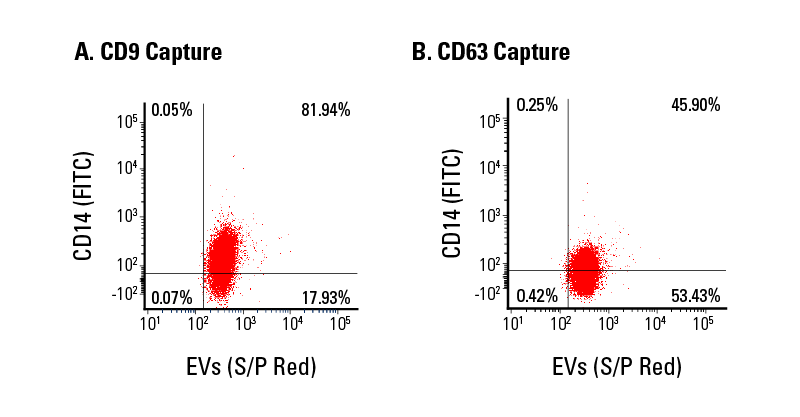亦可做多重 marker 分析,用 CD9 或 CD63 beads 抓取 Exosomes,並同時染 CD14-FITC 抗體。