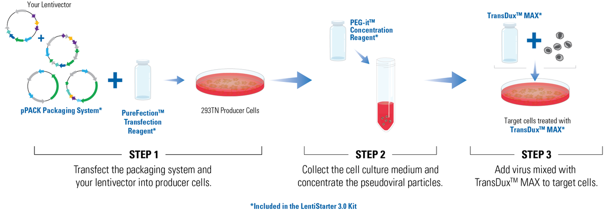 最後把病毒送入欲研究的細胞,Virus Concentraction-PEG-it 濃縮病毒顆粒,可濃縮倍數為 10-100 倍。