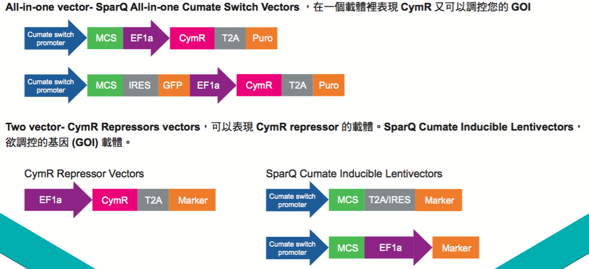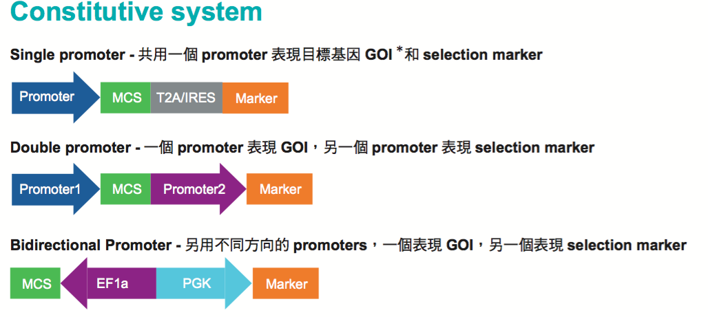 - 主要有兩大類,Constitutive system、Cumate inducible system。