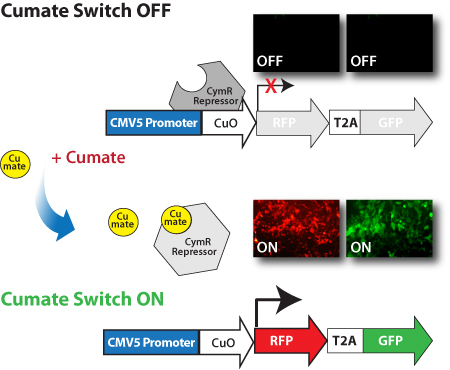 利用 Cumate 存在與否,控制 CymR repressor 是否與 cumate operator sequences 結合,進而影響 GOI 表現。