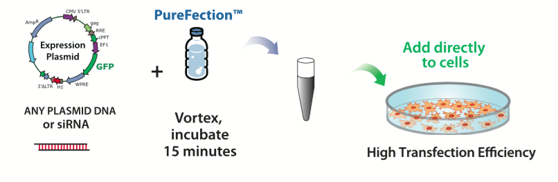 把基因表現載體和包裏病毒系統一起送入細胞工廠 Transfection- Purefection,利用奈米粒子將 DNA 包圍起來,並與 lipid membrane 融合在一起,最後將 DNA 送入細胞。
