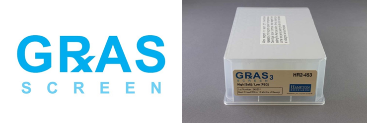 GRAS reagent crystallization screen for proteins, including monoclonal antibodies, (1&2) where Polyethylene glycol is the primary, and Salt the secondary reagent, sampling pH 4-9.(3&4) where Salt is the primary, and Polyethylene glycol the secondary reagent, sampling pH 4-9.(5&6) where Polyethylene glycol is the primary reagent, sampling pH 4.5 to 10. (7&8) where Salt is the primary reagent, sampling pH 4.5 to 10.