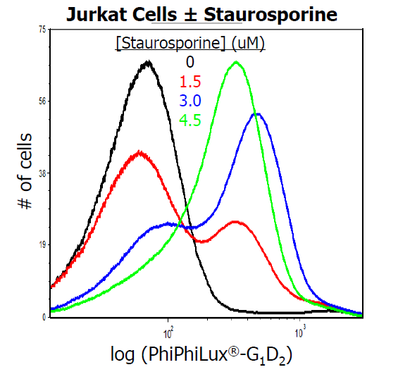 Jurkat 細胞分別處理不同濃度的 Stauroporine,並使用 PhiPhiLux-G1D2 於流式細胞儀偵測 Caspase 3 活性,隨著處理 Stauroporine 濃度越高,細胞凋亡的細胞數越多。