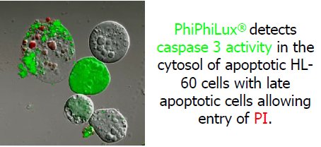 以 PhiPhiLux-G1D2 偵測於 late apoptotic stage 之 HL-60 細胞,綠色螢光表示細胞正處於細胞凋亡狀態,Caspase 3 具有活性,切割試劑中的受質,可在螢光顯微鏡下以 505 nm 波長激發,觀察在放射波長 530 nm 之綠色螢光。