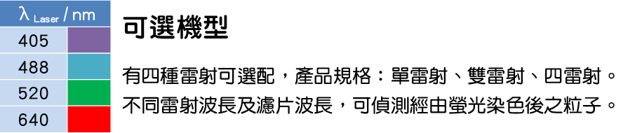 (3) 儀器內置長通濾波片,能夠觀察標有特殊螢光抗體 (Fluorescence antibody) 的奈米粒子,提供更多生物訊息或是更準確的純度數據 。