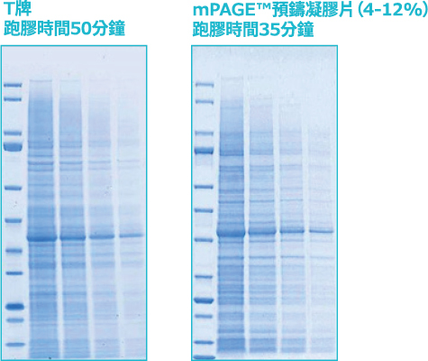 *使用MOPS緩衝液系統比較T牌與mPAGE™預鑄凝膠片(4-12%)的跑膠時間。