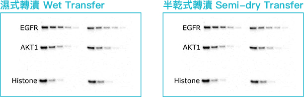 *將序列稀釋的A431細胞裂解液加載至mPAGE™預鑄凝膠片(4-12%),後使用標準操作方式將蛋白質轉漬到Immobilon®-P膜上,接著使用EGFR (180 kDa)、AKT1 (60 kDa)、Histone (17 kDa)抗體進行偵測,最後使用過氧化物酶偶合的二級抗體及Immobilon® Forte化學發光呈色。