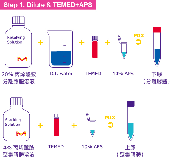 - 加水將 Resolving Mix 稀釋至需求的濃度 % 後加入 10%的APS 及 TEMED