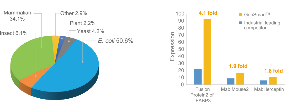 GenSmart ™ 可針對特定物種密碼子使用偏好、GC 含量或二級結構等不利表現的序列調整優化,