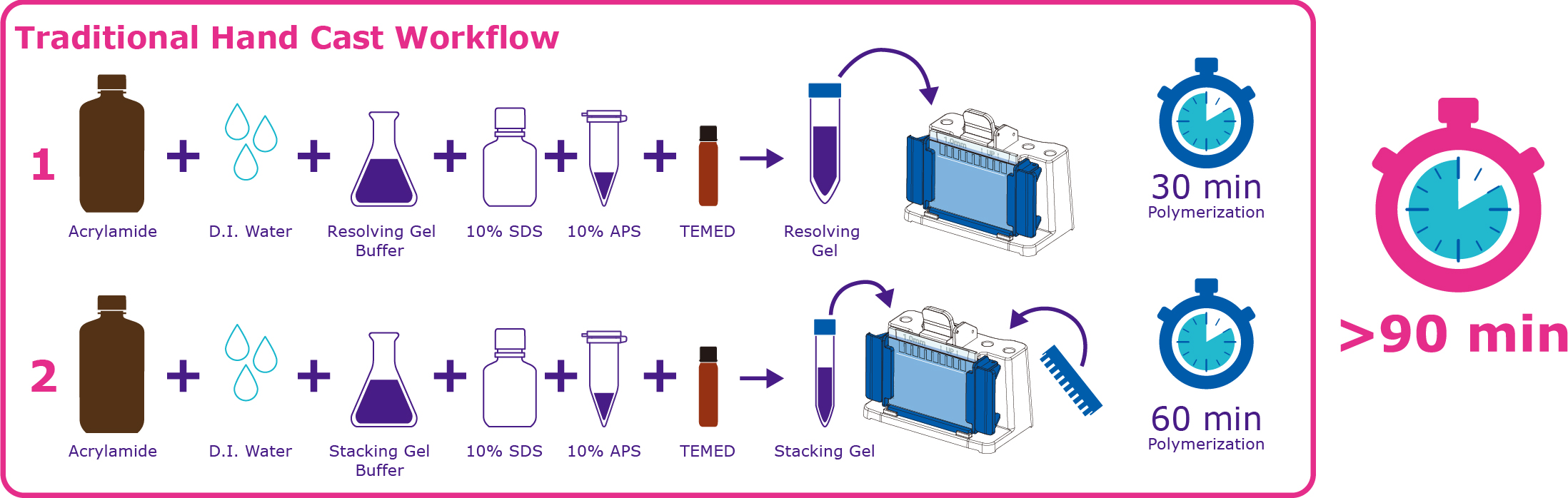 mPAGE® Lux Casting System 光聚合凝膠系統,使用紫外線照射 90 秒快速凝膠, 3 分鐘內即可製作一片膠片。