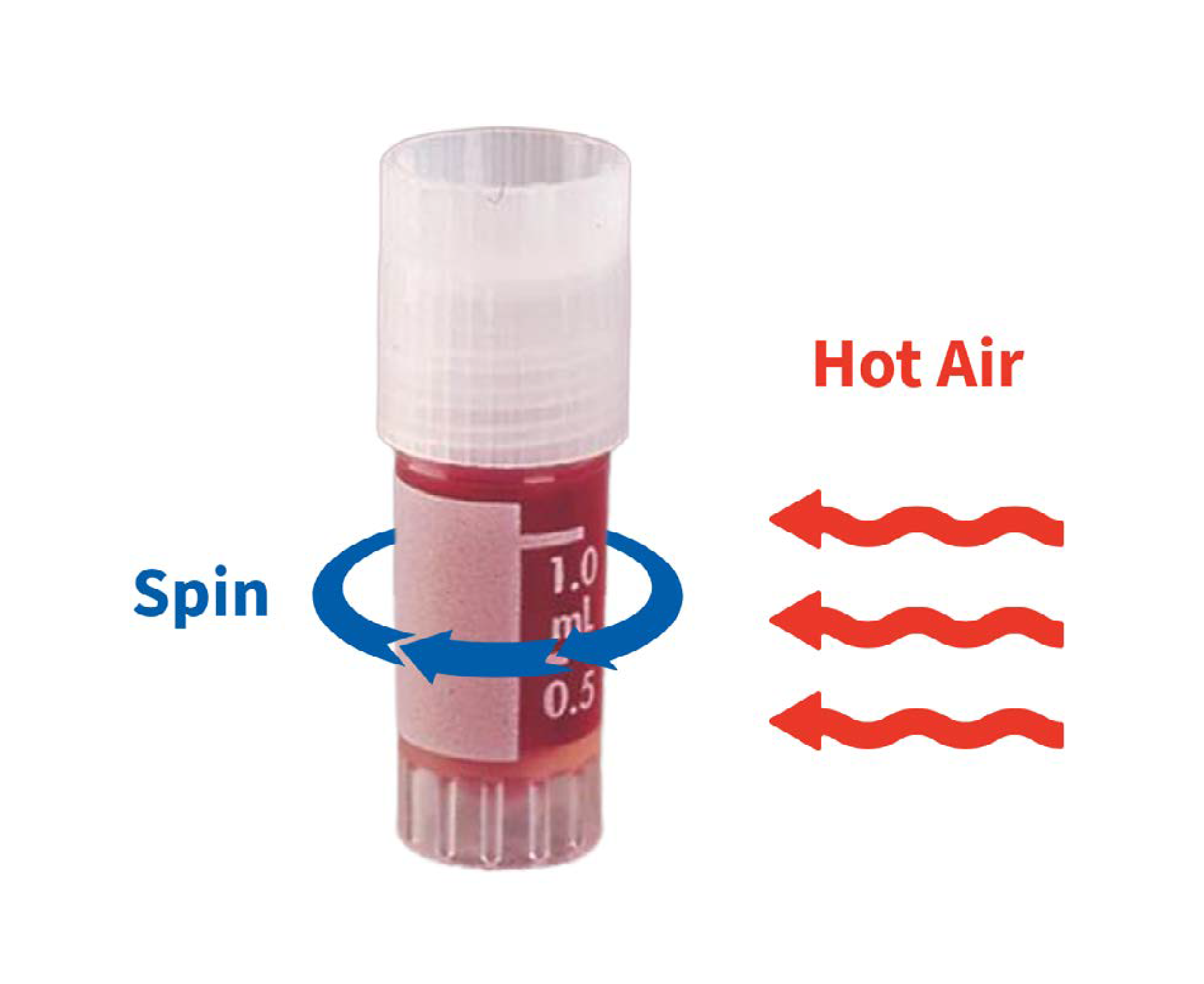 CryoLift 採用先進的乾式空氣循環系統,循環熱空氣垂直於旋轉的冷凍管,確保 360° 全方位加熱。無需與水或導電材料直接接觸,可實現均勻且高效的樣品解凍。加熱空氣持續在冷凍管周圍循環,確保冷凍管所有表面溫度分佈均勻,以實現快速、標準化的解凍時間。
