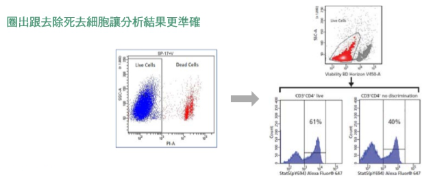 細胞活性 (cell viability) 偵測是分析細胞生長狀況和細胞健康重要的指標之一。 死細胞對於抗體有較強的非特異性結合,當進行流式細胞儀實驗的分析時,利用排除死細胞的 cell viability dye,圈出並去除死細胞,能讓分析結果的統計更加精確