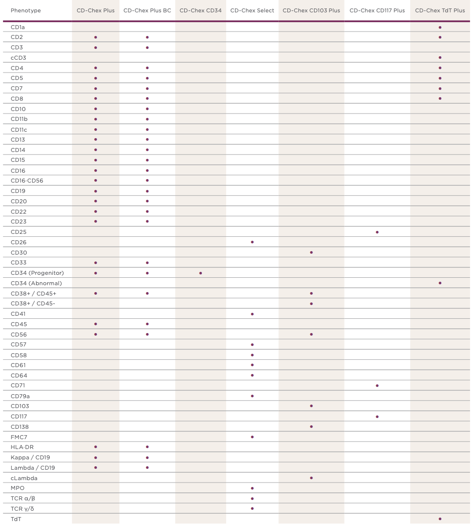 此產品線針對 TBNK、幹細胞、白血病和淋巴腫瘤的 CD markers 提供正常和異常白血球群體作為實驗對照組。
