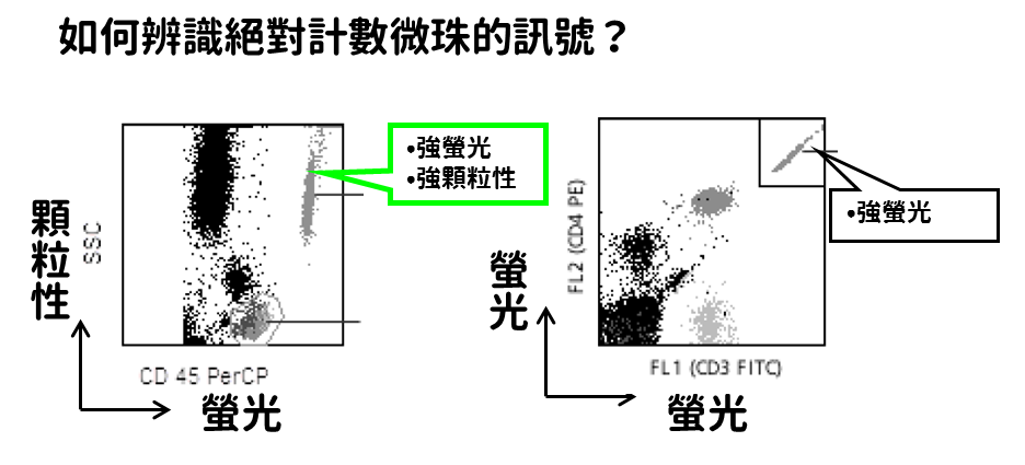 內含已知數量的冷凍乾燥螢光微球作爲內部標準品, 用於得知上樣體積,套入以下公式中求得細胞的絕對濃度。