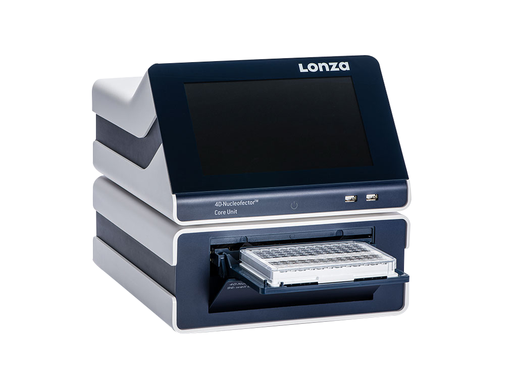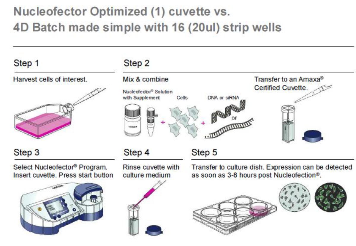 以電穿孔技術為基礎,通過施加電脈衝在細胞膜中瞬間產生小孔將遺傳物質高效率的送入細胞。4D-Nucleofector System 採用模塊化設計和電穿孔技術輔以細胞特異性的電擊液以及電擊程式,不僅降低遺傳物質的使用量,更大大提升轉殖效率與細胞存活率。對於難轉染的初代細胞、幹細胞以及免疫細胞等提供另一選擇。