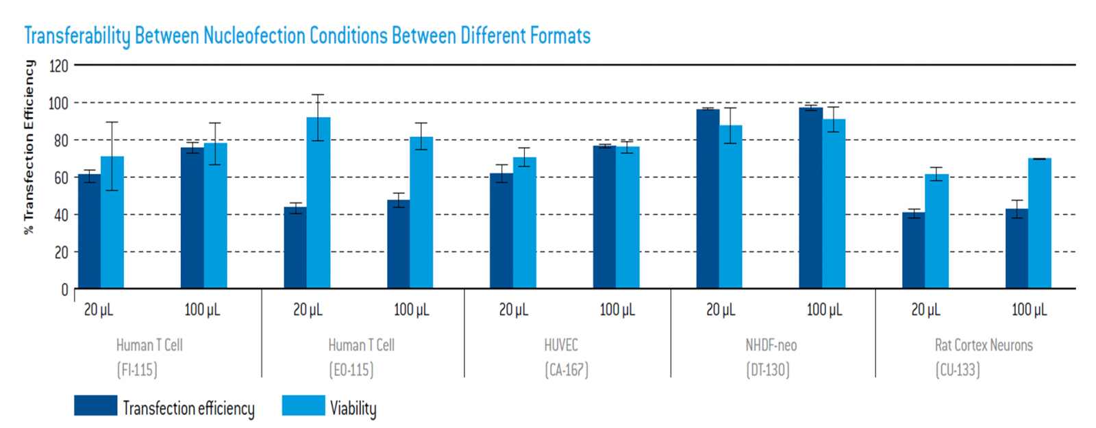 使用確定的程序,以兩種形式 Nucleocuvette™ 轉殖各種原代細胞。分析轉殖 24 小時後的轉殖效率 (flow cytometry) 和活力。