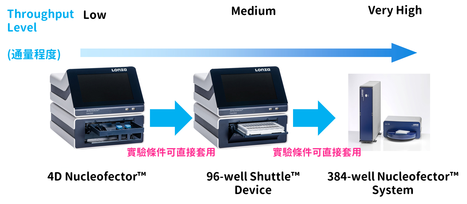 對於高通量轉殖實驗或一次進行不同類型的細胞轉殖,Lonza 提供 Medium Throughput (96-well Shuttle™ Device) 或是 High Throughput (384-well Nucleofector™ System) 機型,讓實驗可僅在短短幾分鐘內完成。此兩高通量轉殖機型為 4D-Nucleofector 系統的附加設備。以 4D-Nucleofector 轉殖系統為基礎,先於 4D-Nucleofector 系統進行轉染條件優化,成功後,可不改變轉染條件,直接用於大通量轉殖中,方便又縮短實驗時間。