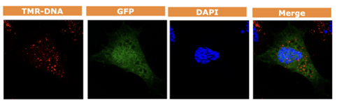 (20180608 training copy p.10) Primary NHDF-neo cells were nucleofected with TMR-labeled plasmid DNA encoding GFP, fixed after 2h in 3.5% PFA and analyzed by confocal microscopy.