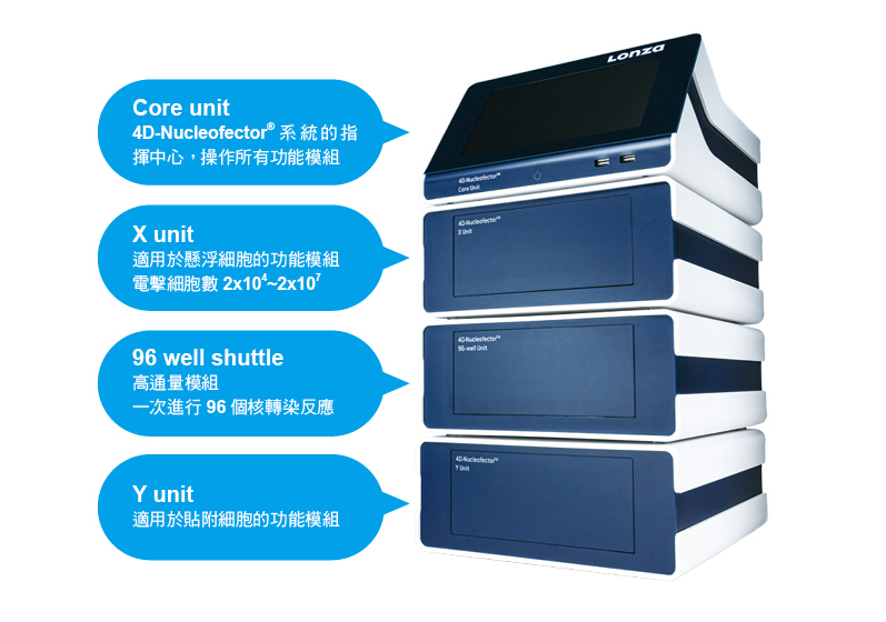 LONZA 4D-Nucleofector 轉殖系統,為一個主機加上不同模塊的配置,可滿足不同細胞類型的轉染實驗需求。